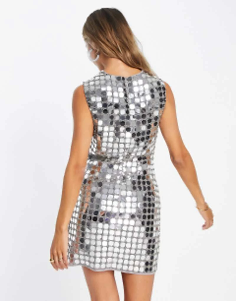 ASOS DESIGN All Over Metallic Mosiac Embellised Mini Shift Dress In Silver