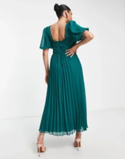 ASOS DESIGN Puff Sleeve Pleated Dobby Midi Dress With Scallop Trim In Forest Green