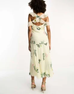 ASOS DESIGN Multi Flutter Sleeve Ruffle Midaxi Dress With Button Detail In Lemon Floral Print