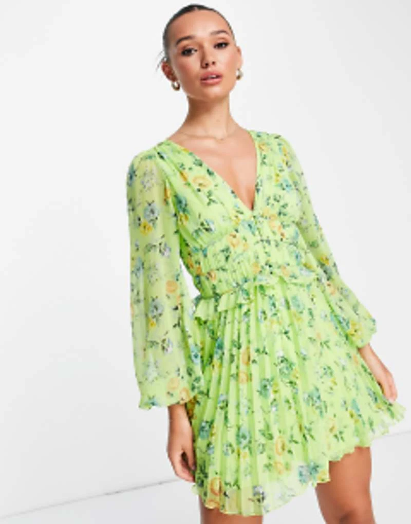 ASOS DESIGN Button Through Ruched Waist Pleated Mini Dress In Green Floral Print