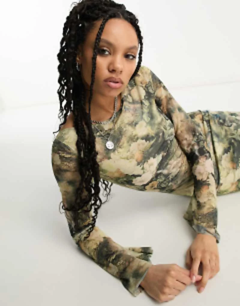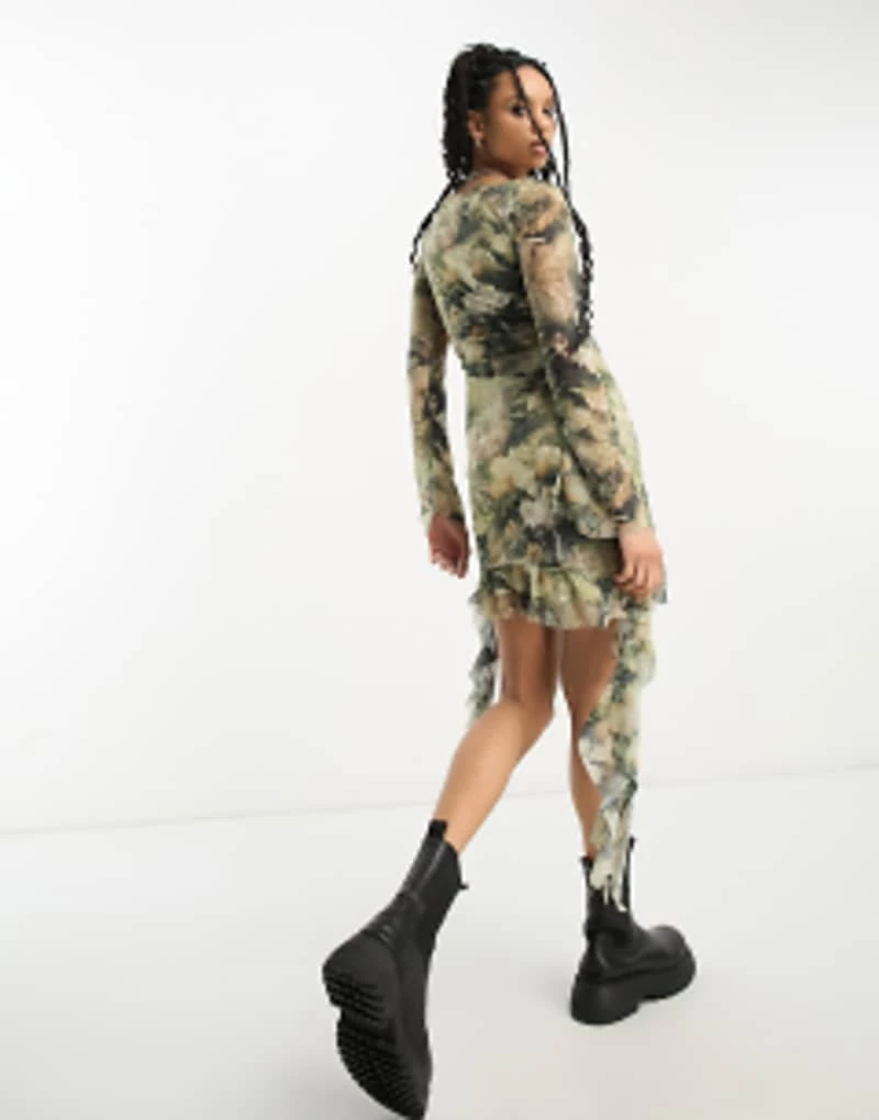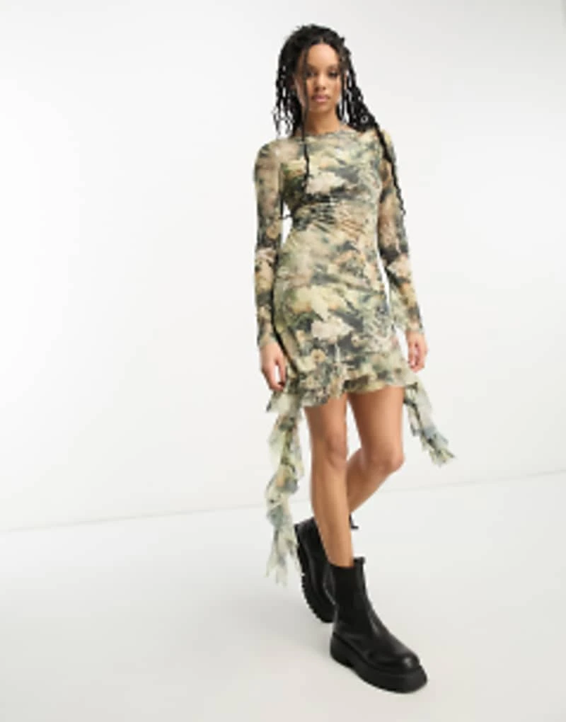 ASOS DESIGN Chiffon Long Sleeve Mini Dress With Ruffle Hem In Grungey Floral Print