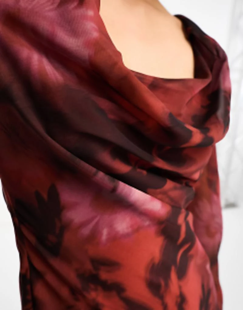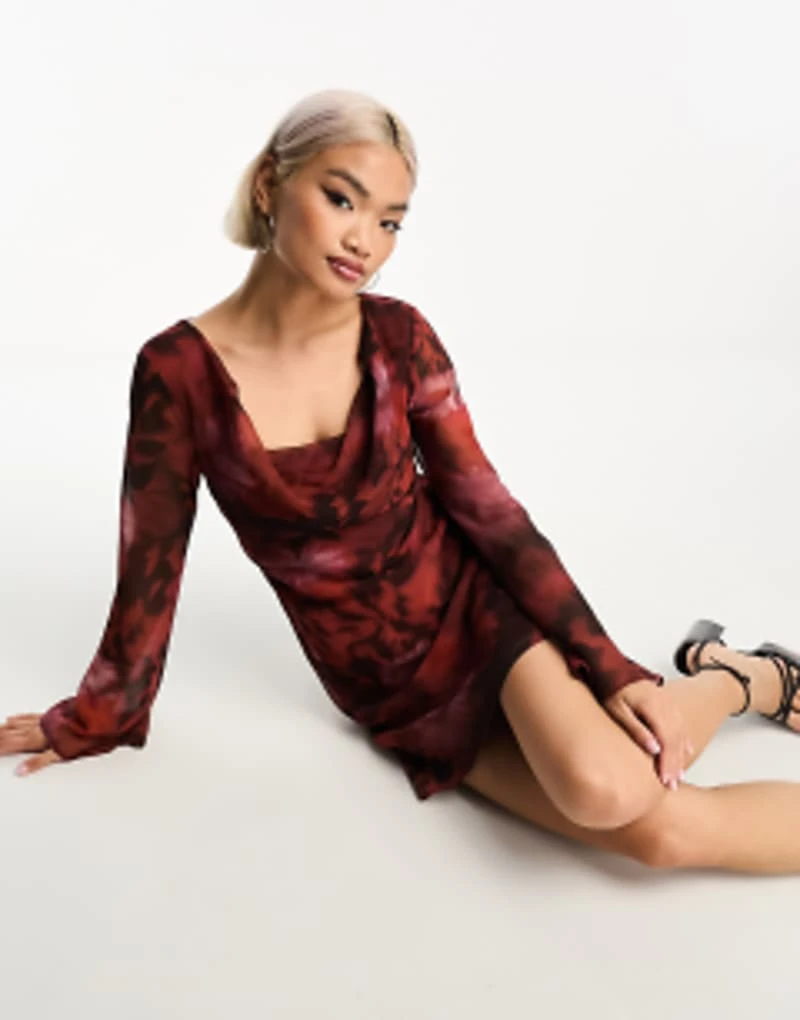 ASOS DESIGN Cowl Neck Flute Sleeve Chiffon Mini Dress In Dark Floral