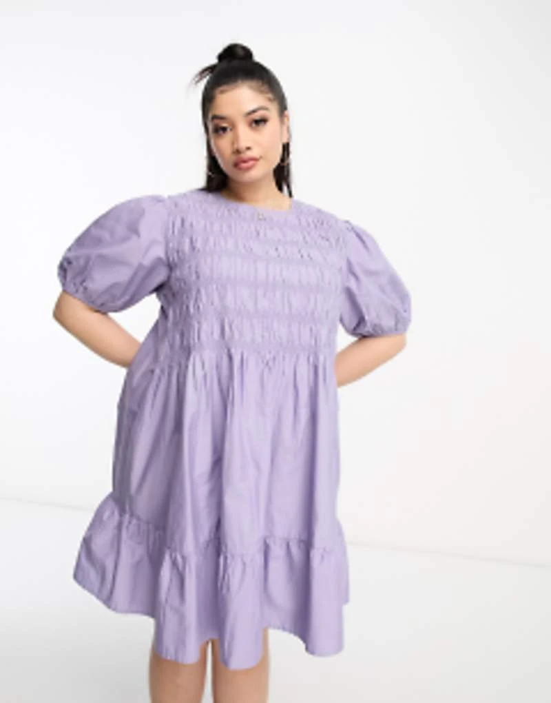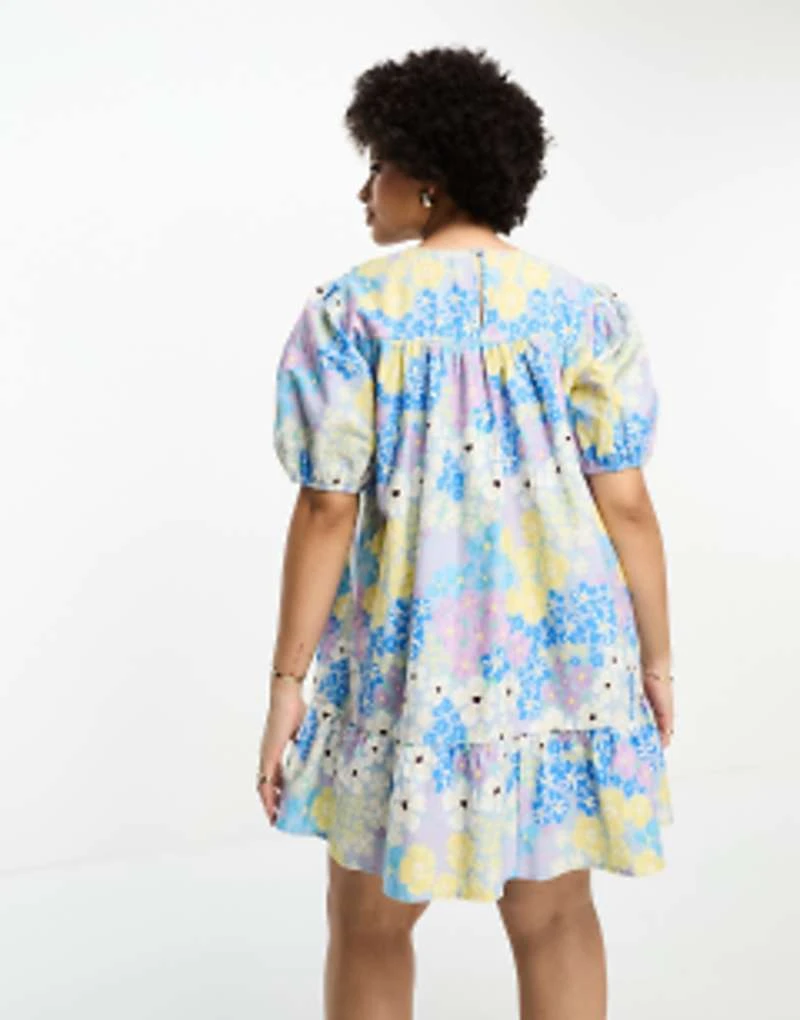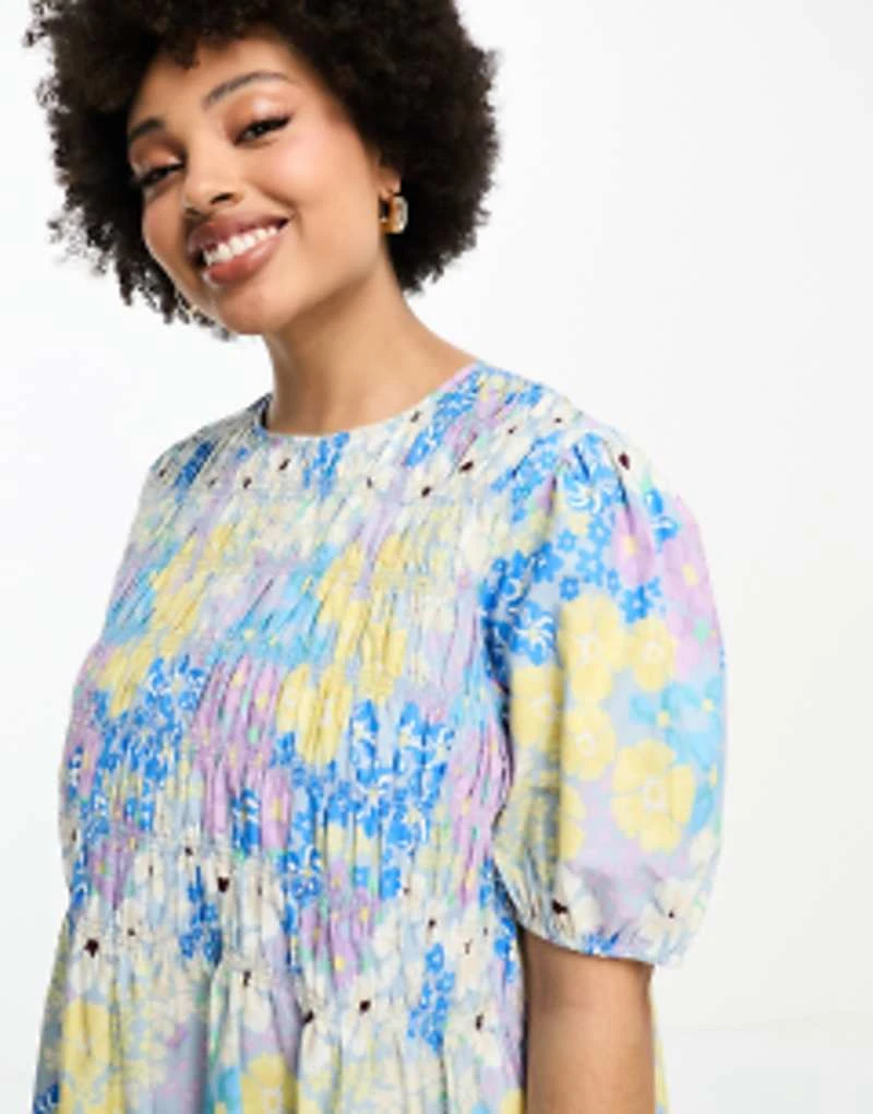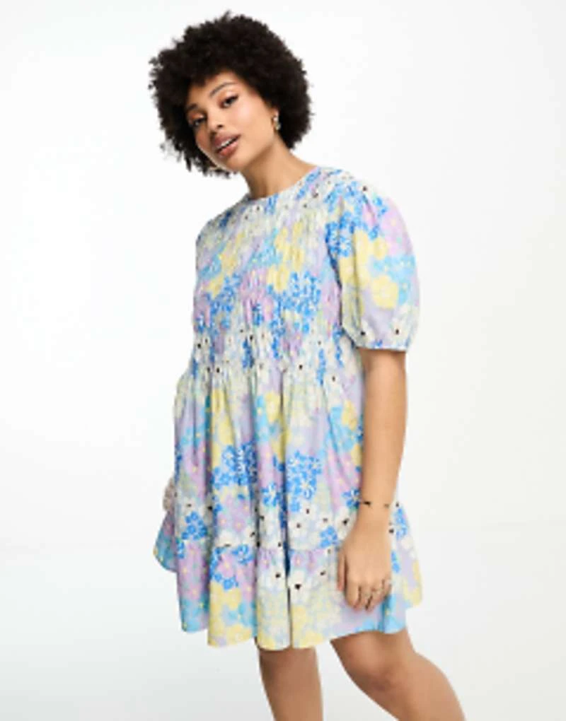 ASOS DESIGN Curve Cotton Shirred Mini Smock Dress With Puff Sleeve In Floral Print