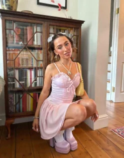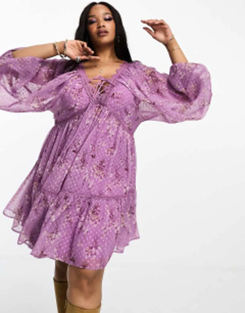 ASOS DESIGN Curve Lace Trim Plunge Batwing Mini Dress With Pep Hem In Lilac Floral Dobby