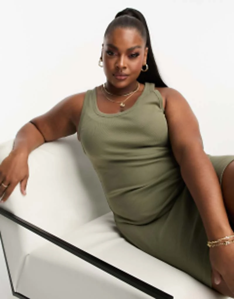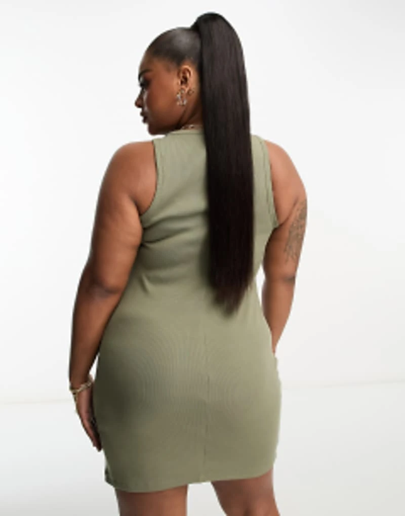 ASOS DESIGN Curve Ribbed Scoop Neck Vest Mini Dress In Khaki