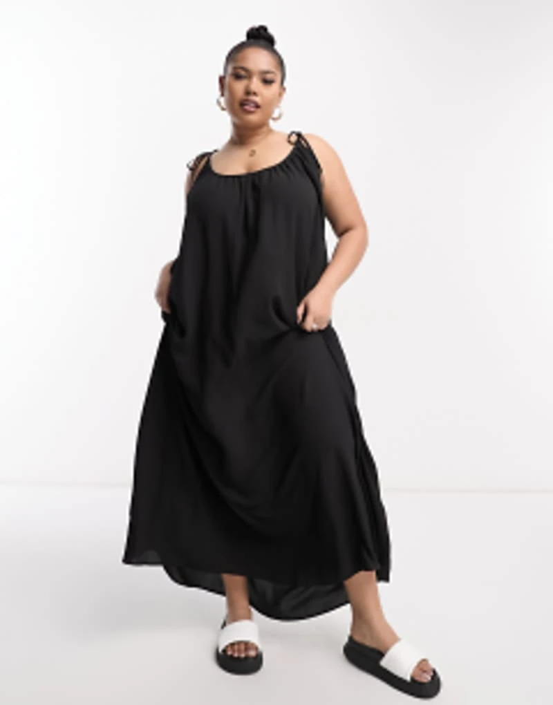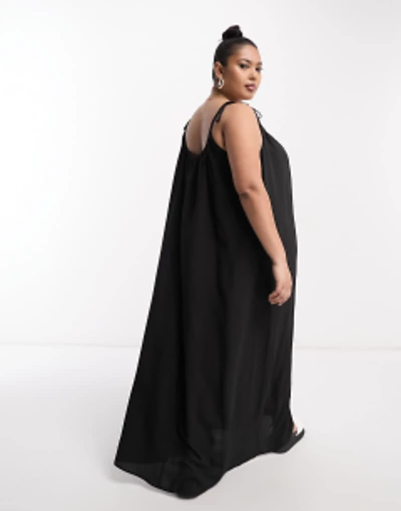 ASOS DESIGN Curve Tie Strap Detail Trapeze Maxi Slip Dress In Black