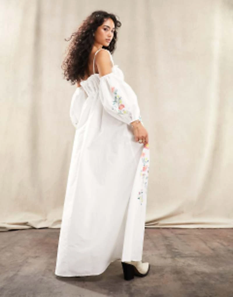 ASOS DESIGN Embroidered Off Shoulder Cotton Maxi Dress With Ruched Bust Detail In White