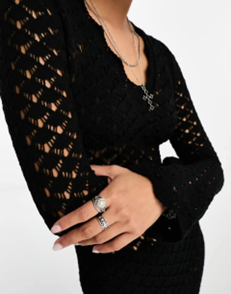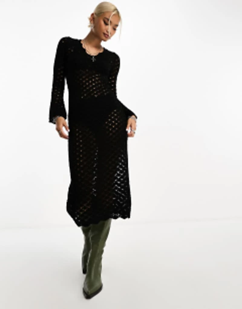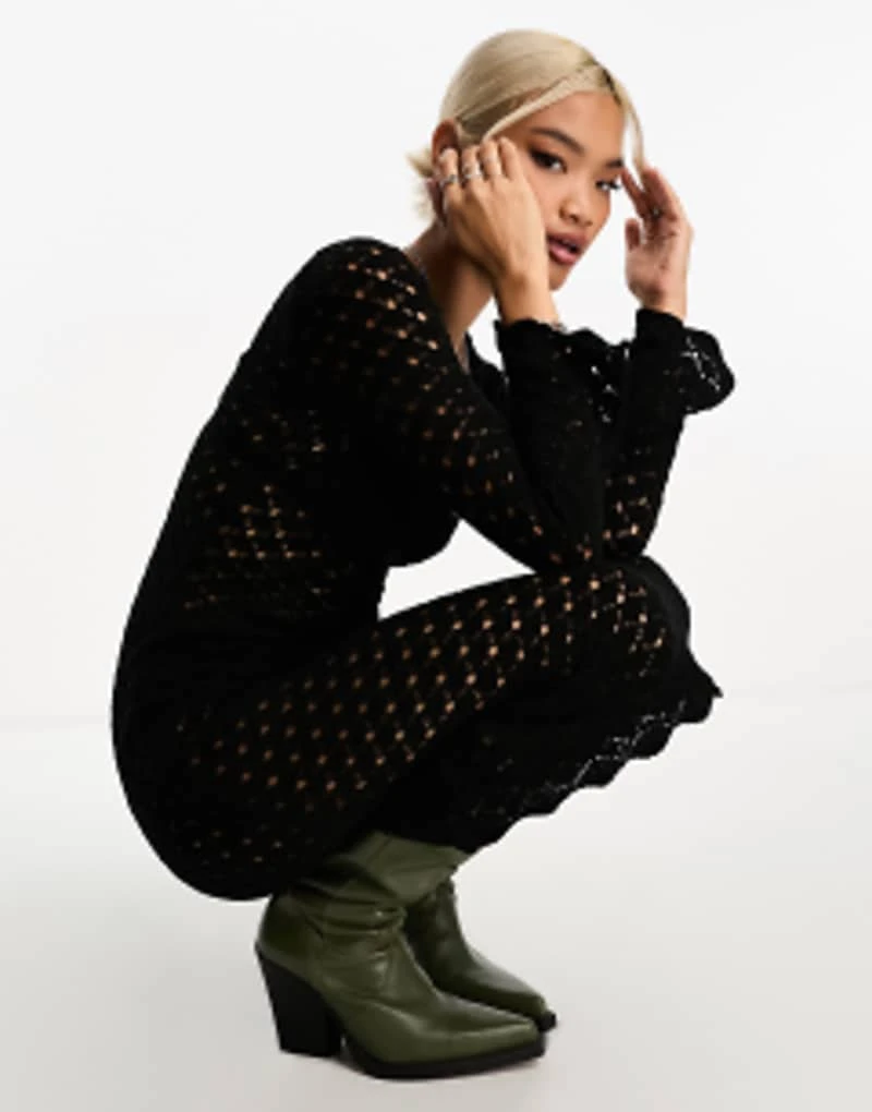 ASOS DESIGN Knitted Long Sleeve Maxi Dress In Pointelle Stitch In Black
