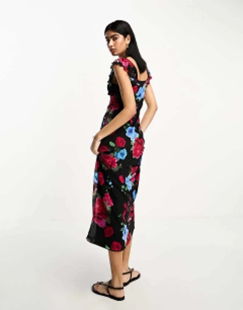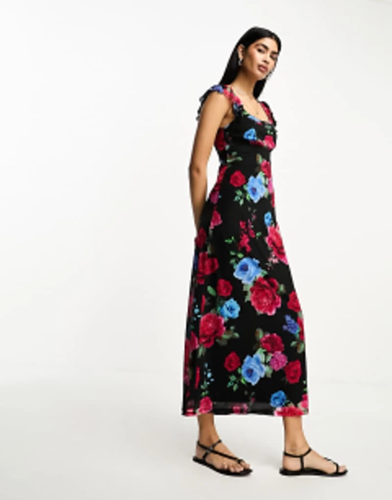 ASOS DESIGN Mesh Scoop Neck Frill Sleeve Maxi Dress In Floral Print
