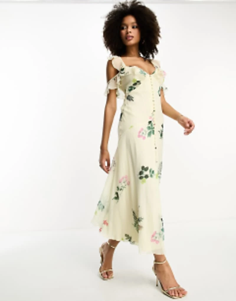 ASOS DESIGN Multi Flutter Sleeve Ruffle Midaxi Dress With Button Detail In Lemon Floral Print