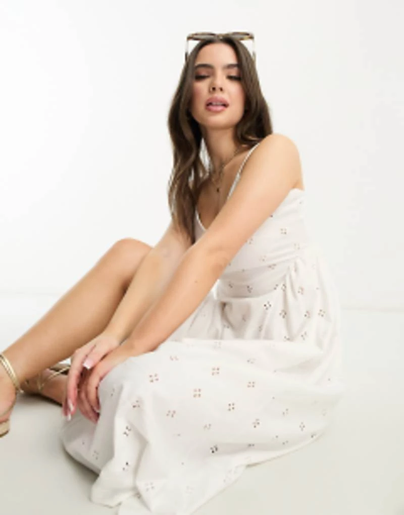 ASOS DESIGN Petite Broderie Strappy Back Detail Midi Dress With Seam Detail In White