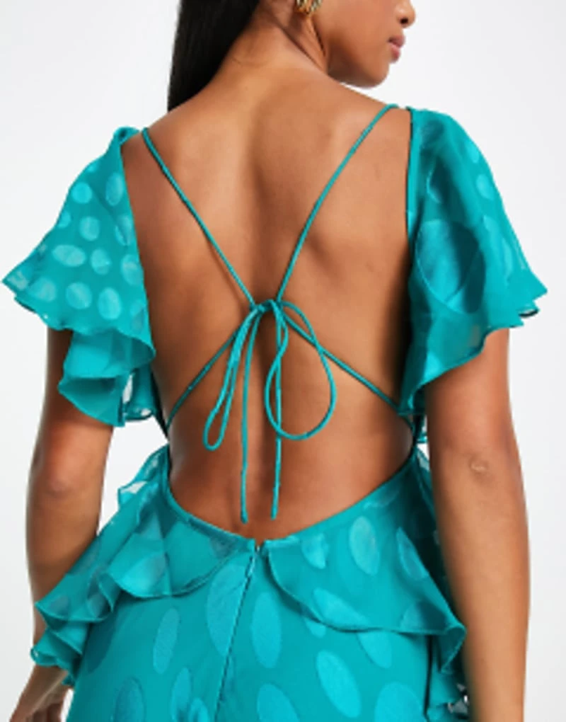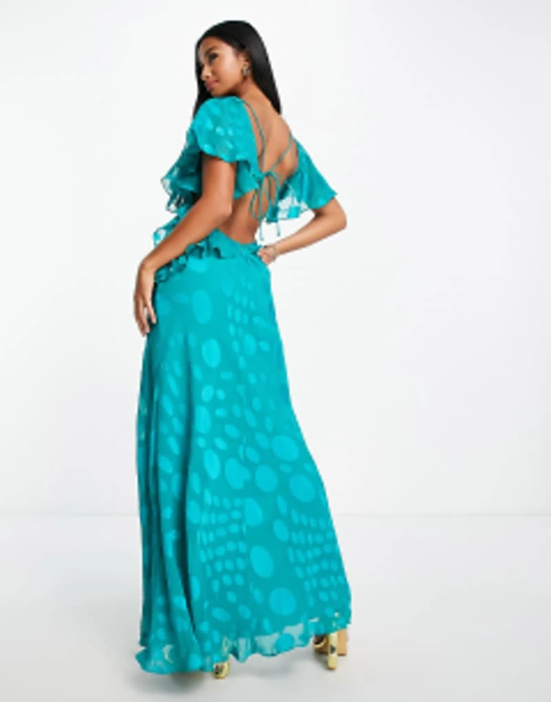 ASOS DESIGN Petite Satin Spot Flutter Sleeve Maxi Dress With Open Back In Deep Aqua
