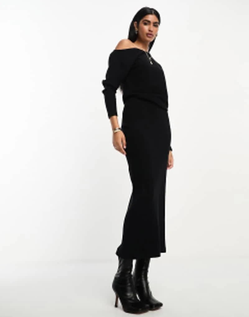 ASOS DESIGN Super Soft Rib Midi Jumper Dress With Fallen Shoulder In Black