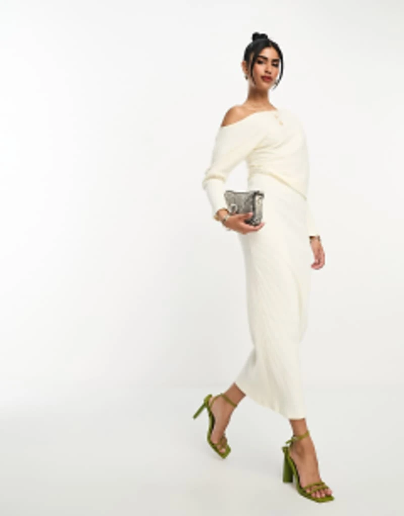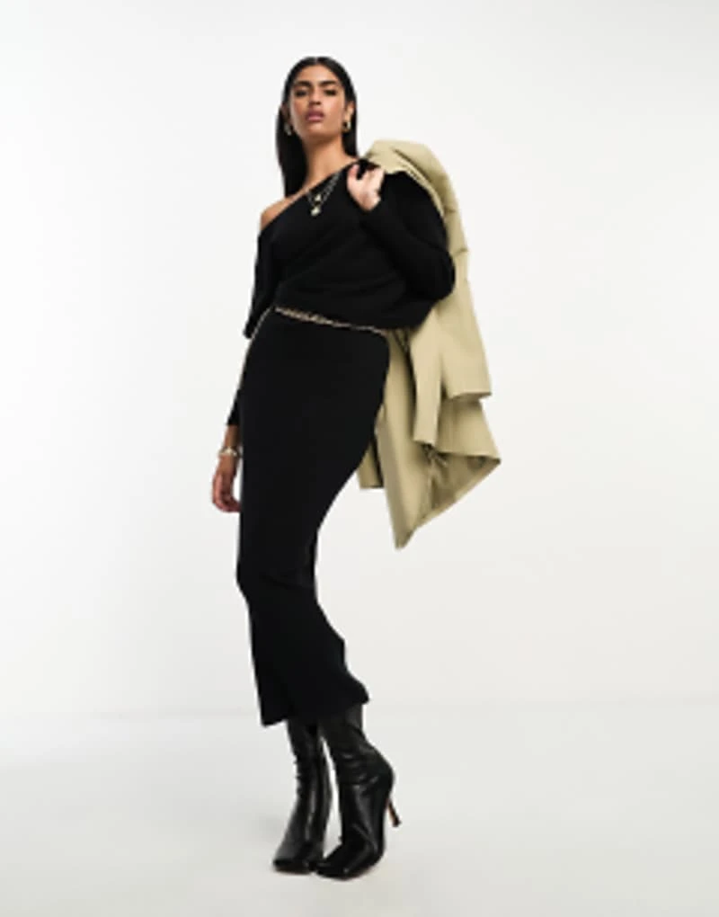 ASOS DESIGN Super Soft Rib Midi Jumper Dress With Fallen Shoulder In Chocolate