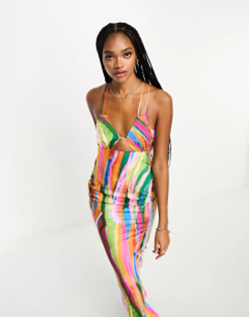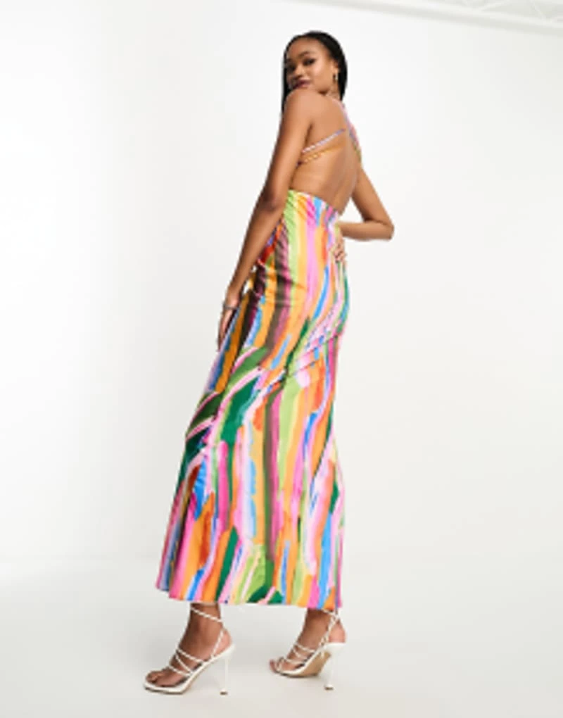 ASOS DESIGN Tall Satin Cut Out Detail Bust Maxi Dress In Multi Stripe Print