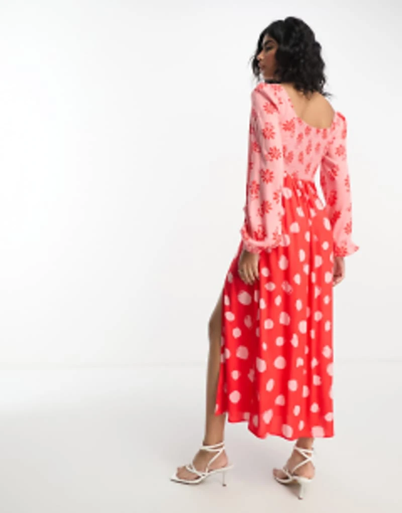 ASOS DESIGN Viscose Sweetheart Neckline Long Sleeve Midi Dress In Mixed Print