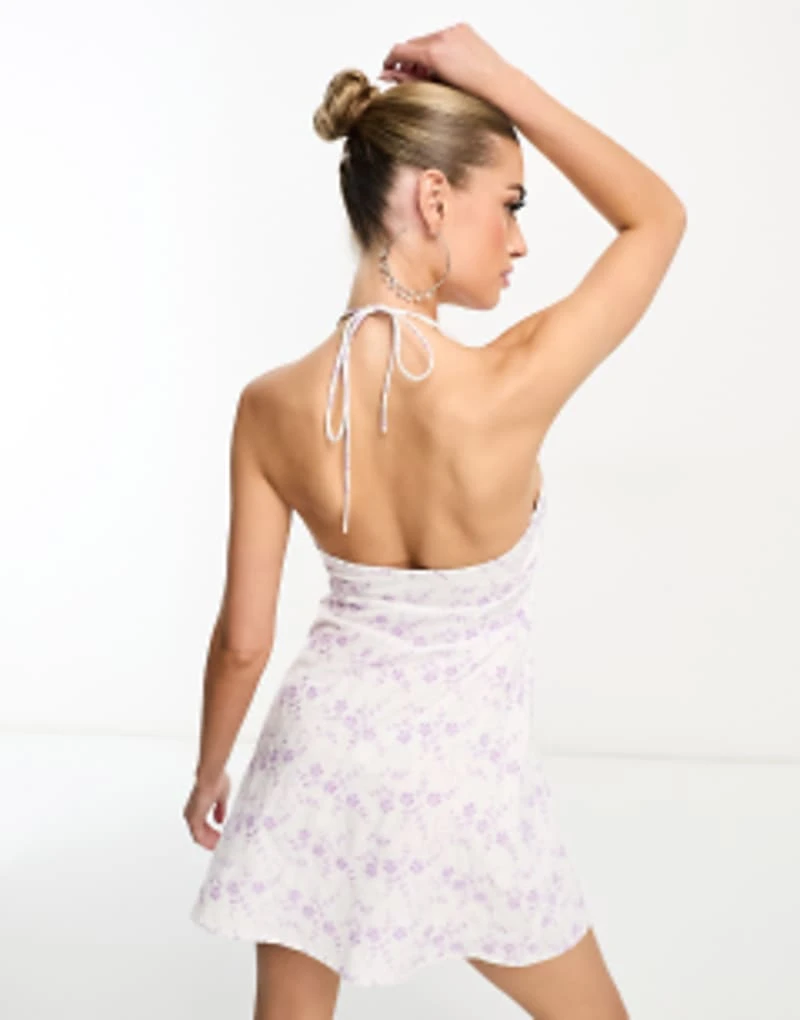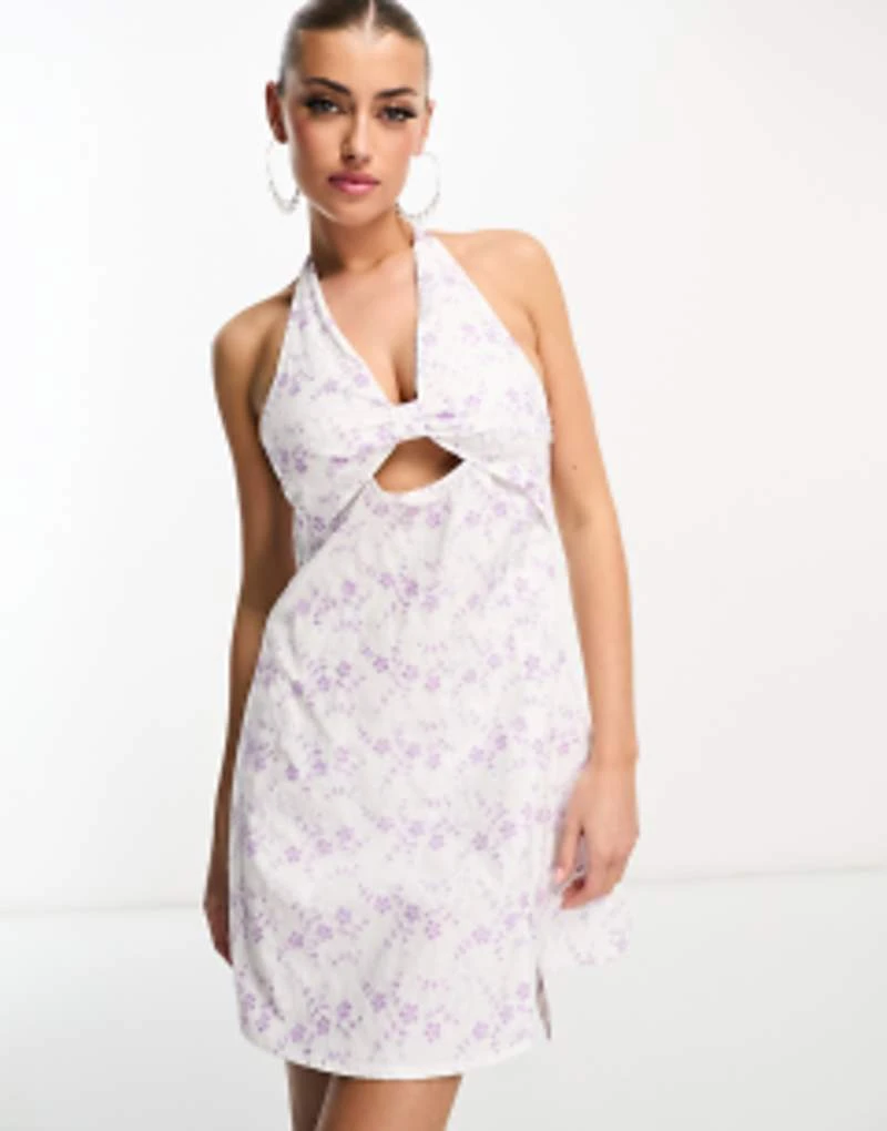 ASYOU Knot Front Halter Neck Mini Dress In Lilac Broderie