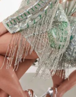 ASOS EDITION Sequin And Fringe Artwork Long Sleeve Bodycon Mini Dress In Soft Green