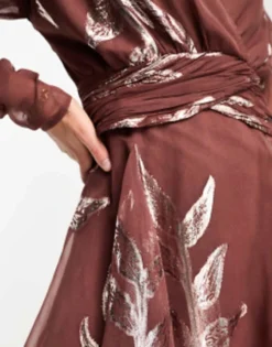 ASOS DESIGN Wrap Bodice Mini Tea Dress In Mocha Metallic Jacquard