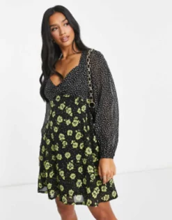 New Look Petite Mixed Print Puff Sleeve Long Sleeve Milkmaid Mini Dress In Black Floral
