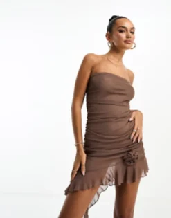 Missyempire Mesh Bandeau Asymmetric Ruffle Hem Mini Dress In Brown