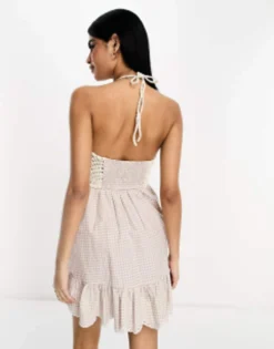 ASOS DESIGN Crochet Halter Mini Dress With Broderie Hem In Gingham