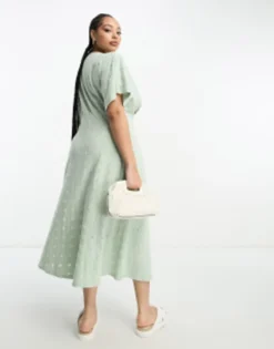 ASOS DESIGN Curve Broderie V Neck Midi Dress With Buttons In Sage And Cream Contrast