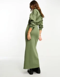 ASOS DESIGN Crew Neck Ribbed Blouson Sleeve Maxi Dress In Khaki