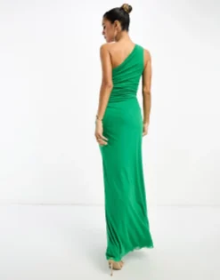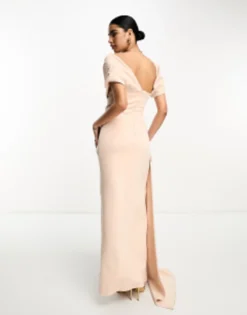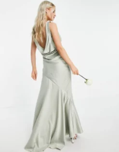 ASOS DESIGN Petite Bridesmaid Cowl Back Satin Maxi Dress With Button Side Detail In Olive