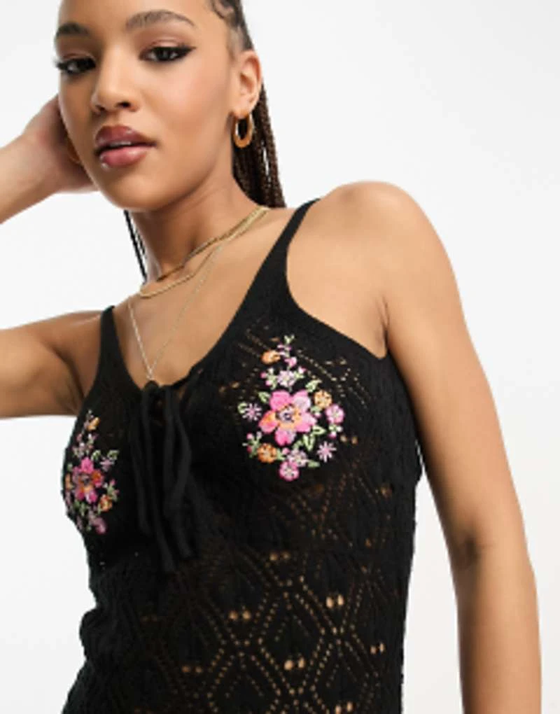 Miss Selfridge Embroidered Detail Crochet Mini Dress In Black