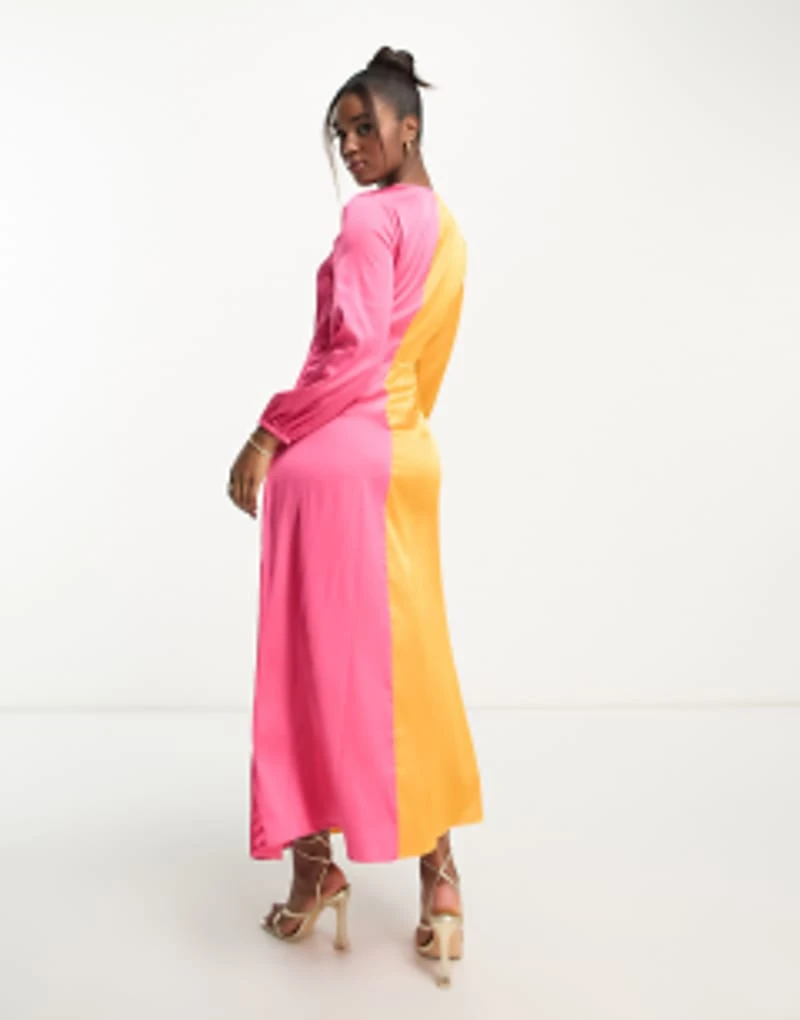 Monki Long Sleeve Ruched Satin Colour Block Front Maxi Dress In Multi
