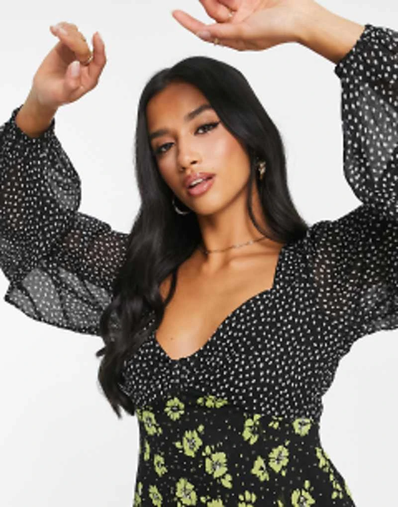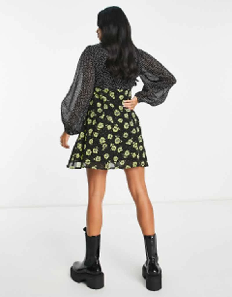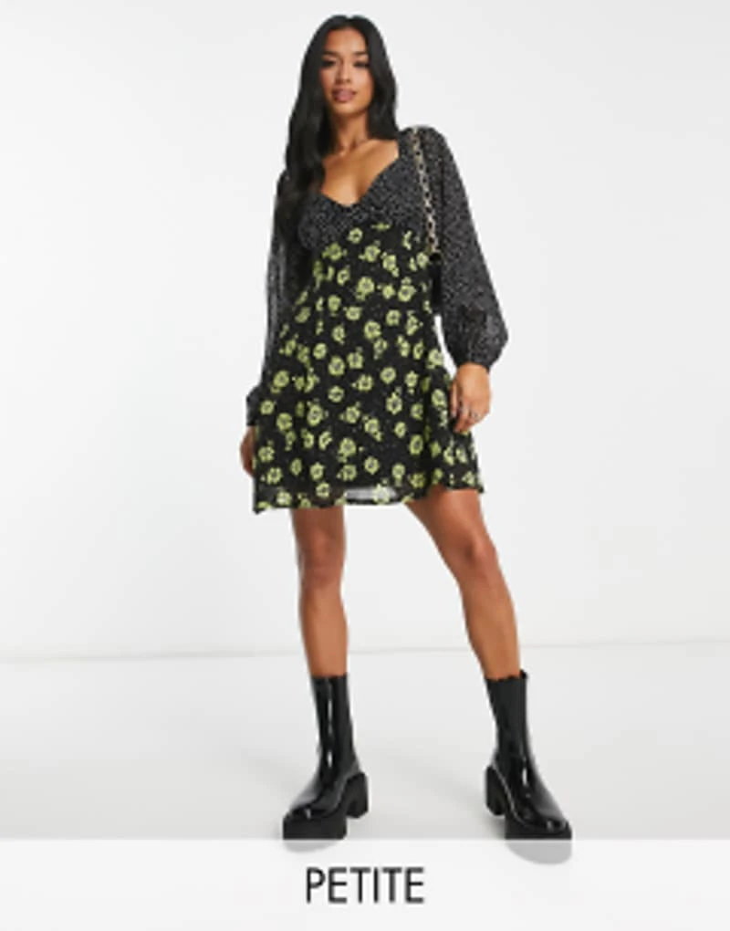 New Look Petite Mixed Print Puff Sleeve Long Sleeve Milkmaid Mini Dress In Black Floral