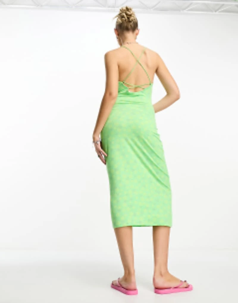 Noisy May High Neck Cross Midi Slip Dress In Green Flower Print