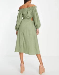 ASOS DESIGN Off Shoulder Cut Out Waist Midaxi Beach Dress In Khaki