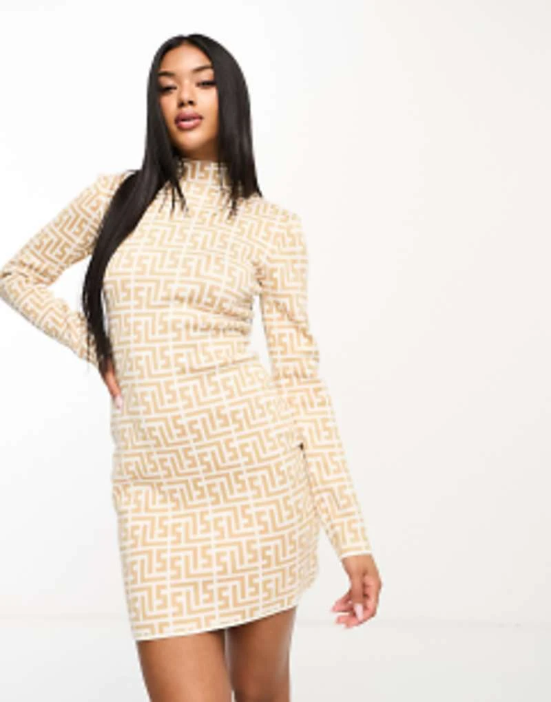 Simmi High Neck Mini Jumper Dress In Beige Geo Print