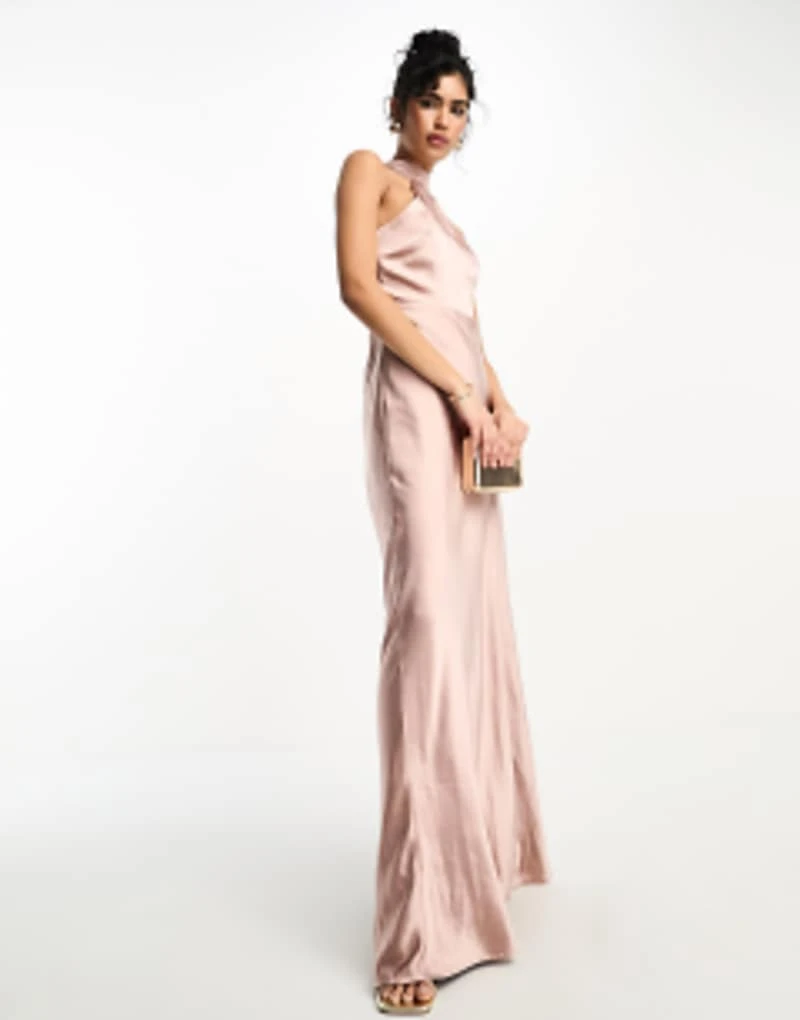 Six Stories Bridesmaids Halter Neck Satin Maxi Dress In Rose