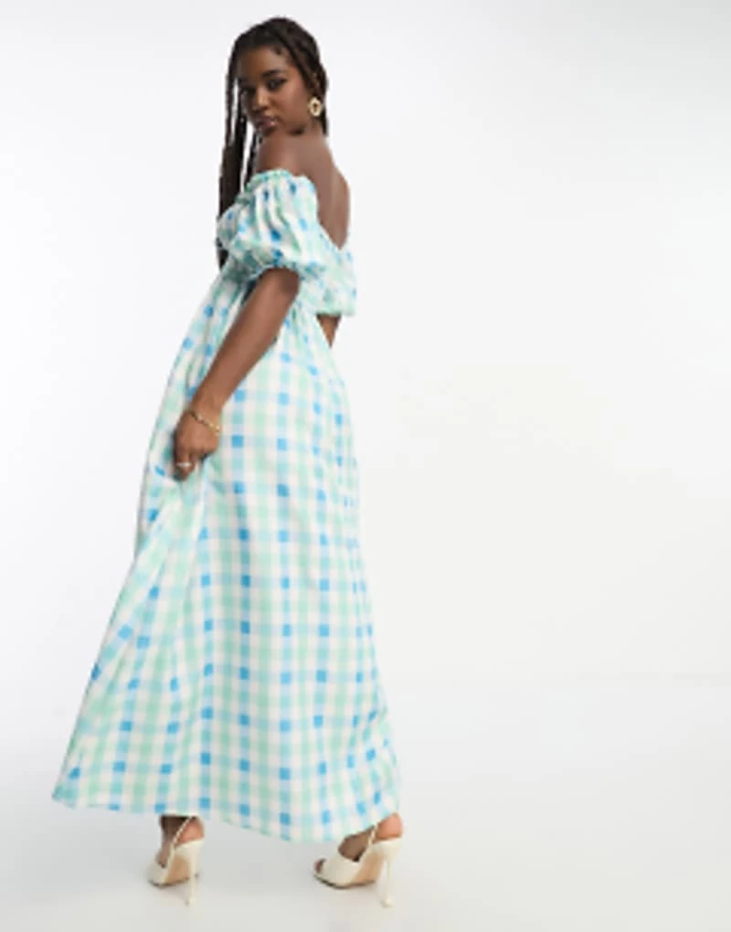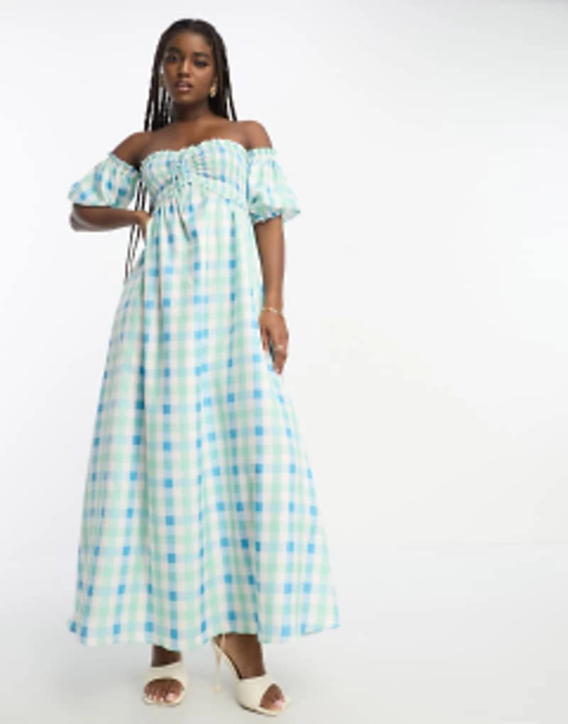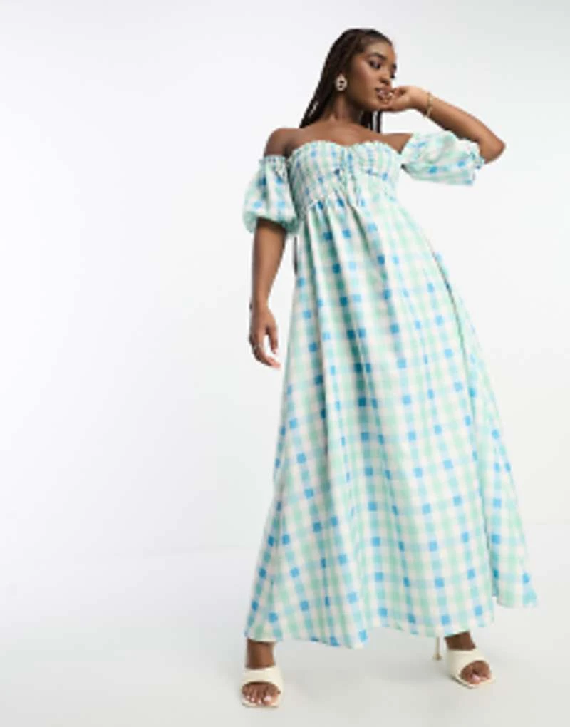 The Frolic Check Off-shoulder Shirred Maxi Dress In Blue