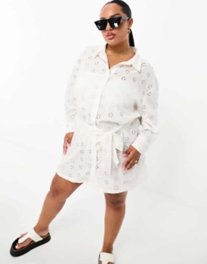 Threabdare Plus Broderie Tie Waist Shirt Dress In White