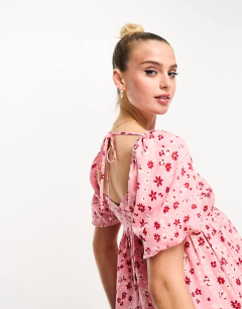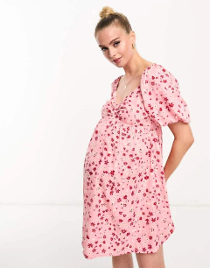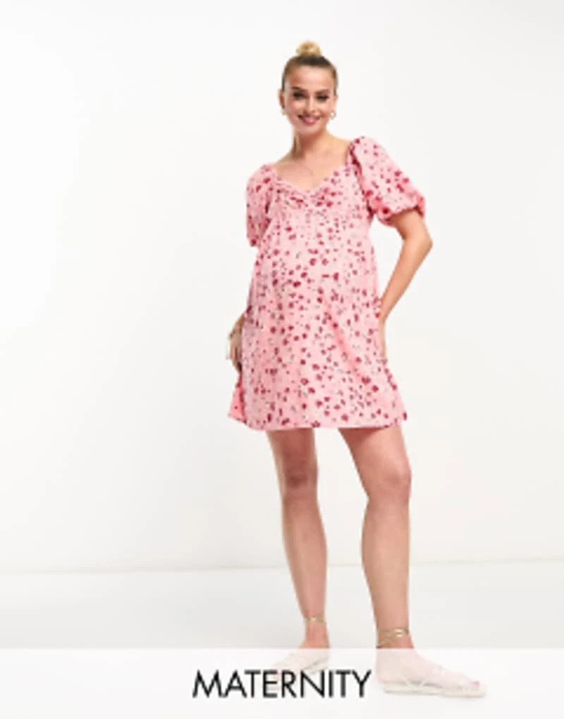 Wednesday’s Girl Maternity Puff Sleeve Ditsy Floral Print Mini Dress In Pink